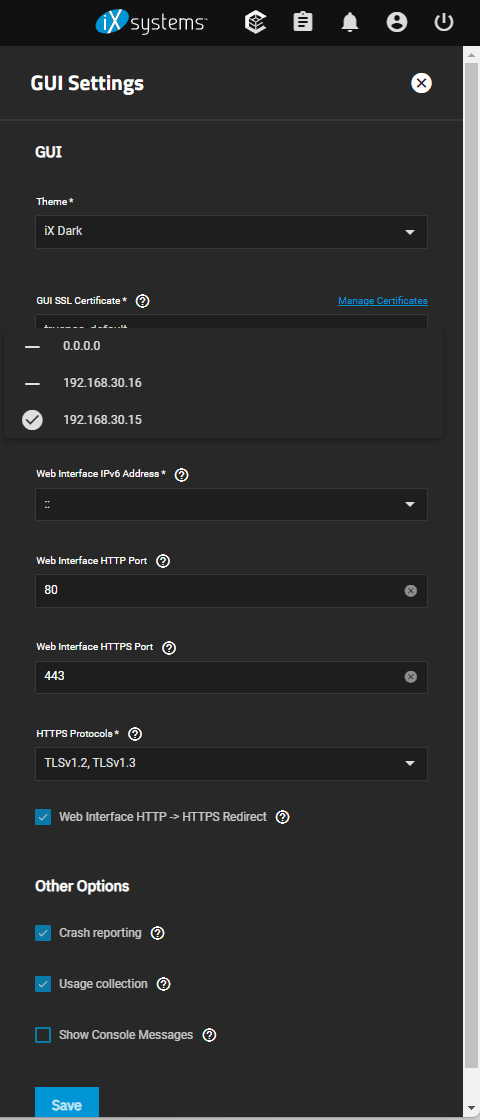 Under Web Interface IPv4 Address, I’m only going to select one IP address (192.168.30.15) and also enable the HTTP → HTTPS Redirect. These settings will ensure that the TrueNas web GUI will only listen on 192.168.30.15 on ports 80 and 443 and will redirect 80 to 443. This also means that I can use 192.168.30.16, ports 80 and 443 for Nextcloud.